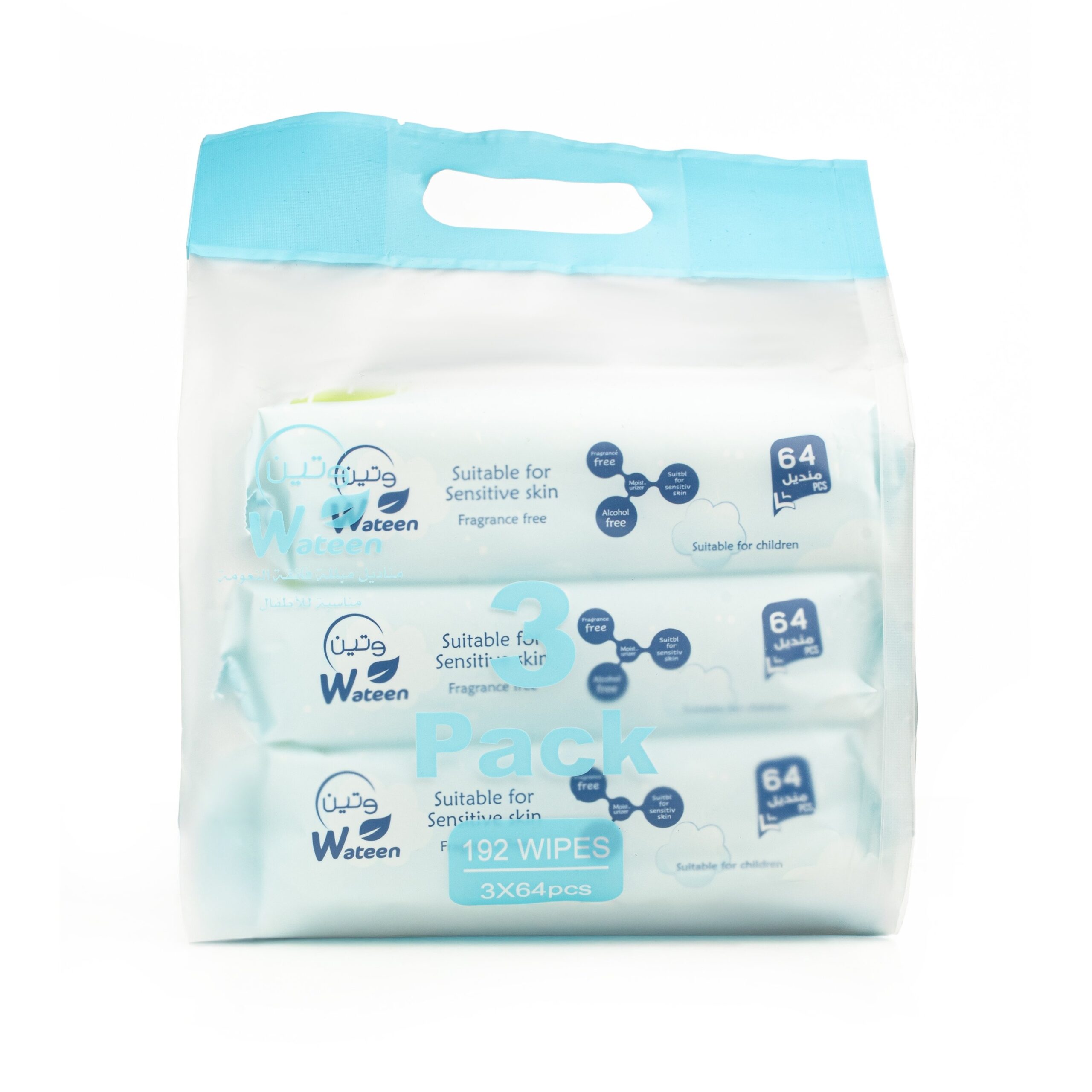 مناديل مبللة وتين خالي من الكحول والعطور (3*64) 192قطعه